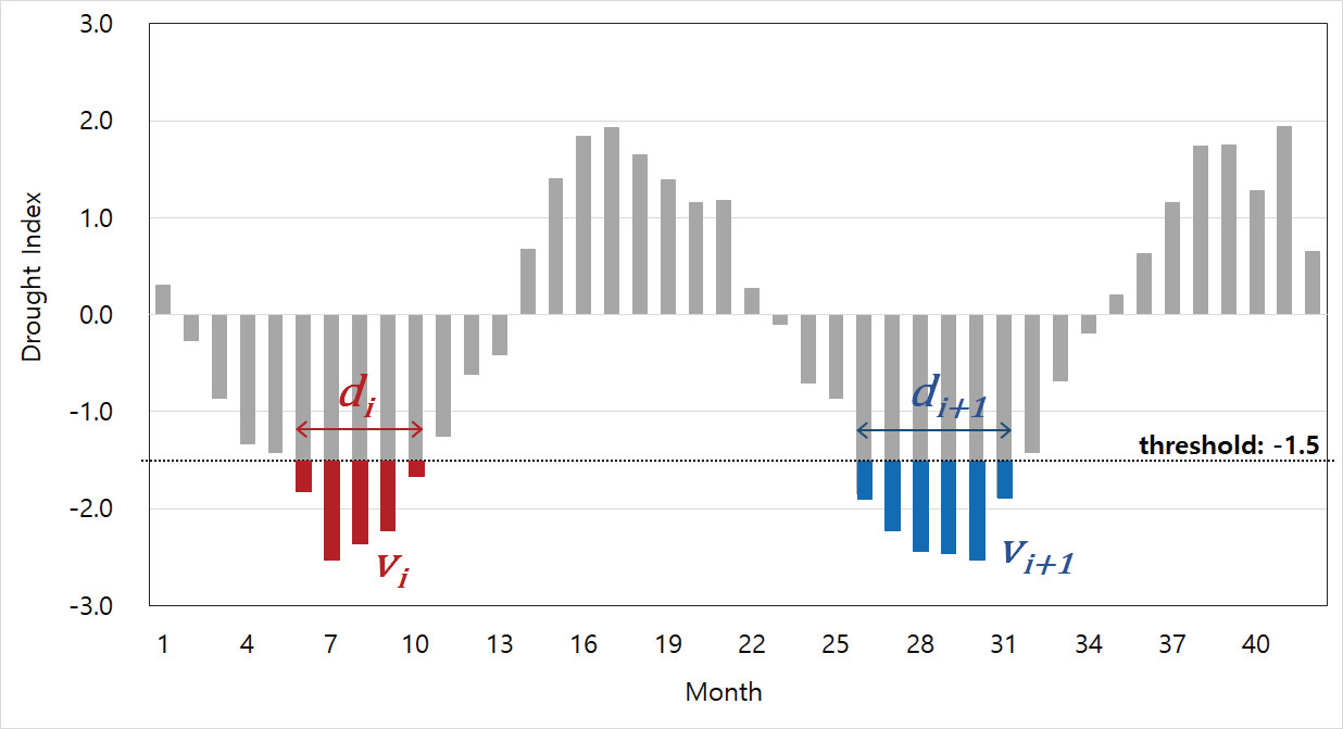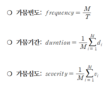 - 주: M은 계획 기간 동안 발생한 가뭄 사건의 수, T는 계획 기간의 총 길이(총 개월 수),di은 번째 가뭄 사건의 길이,vi은 i번째 가뭄 사건의 규모로서 가뭄 기간 동안의