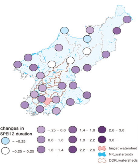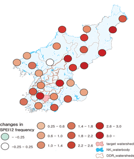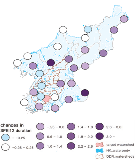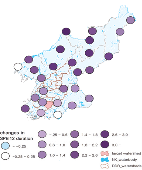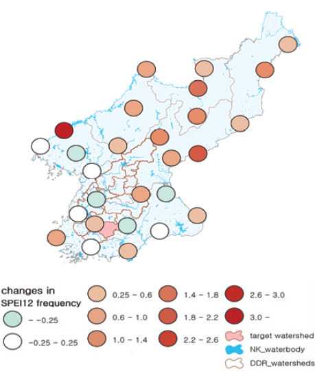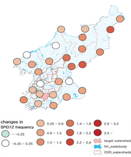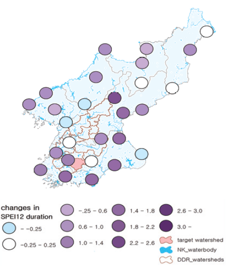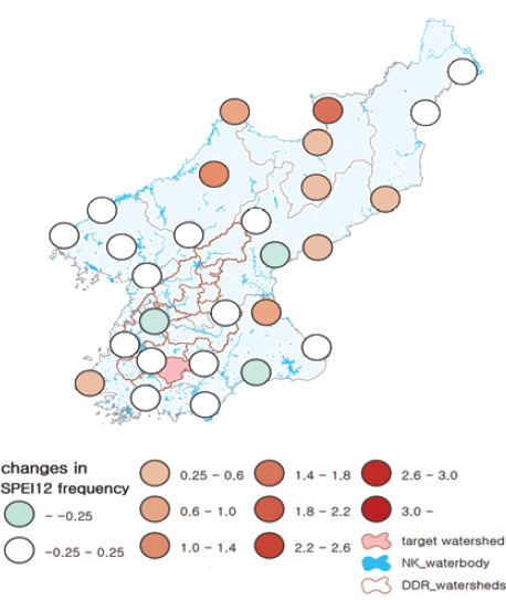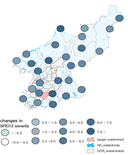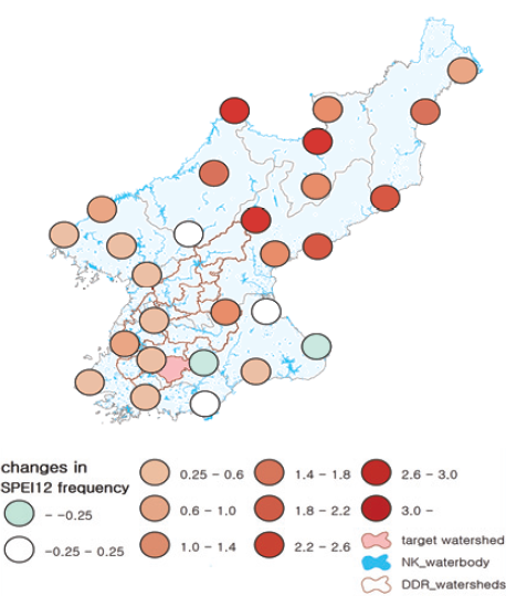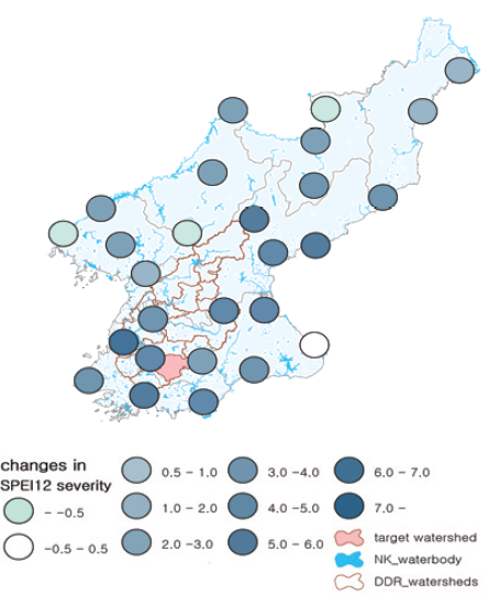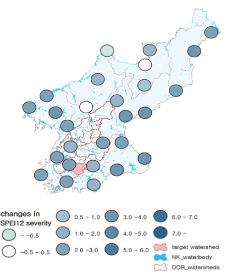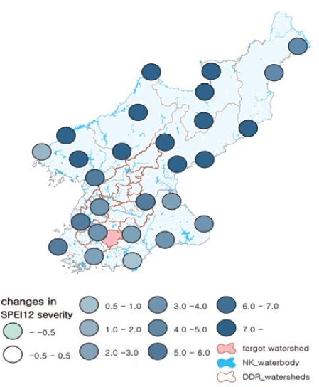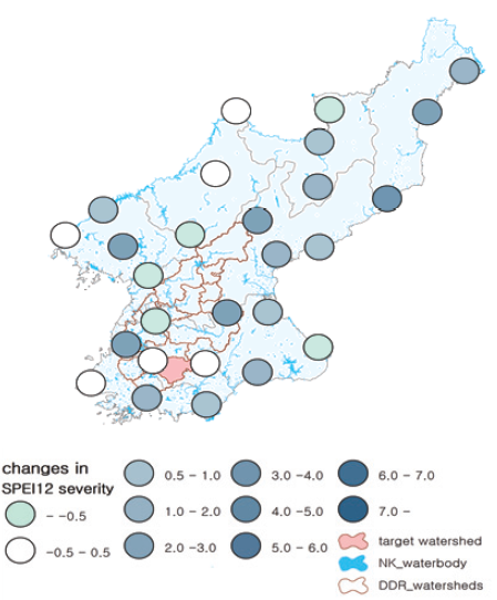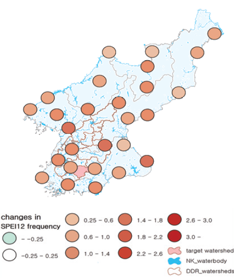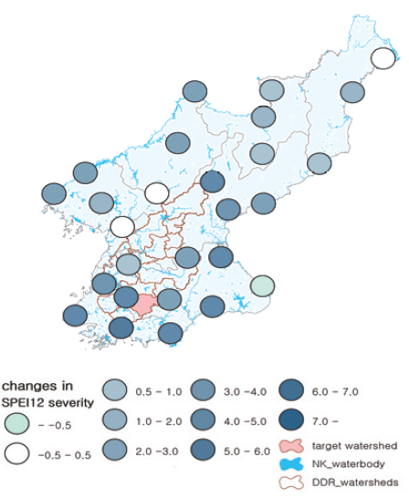 북한 지역의 미래 기후변화의 전망을 위해 가뭄지수 중 하나인 SPEI(Standardised Precipitation Evapotranspiration Index)를 사용하여 2100년까지의 장기 추세를 분석하였다. SPEI는 강수량과 증발산량의 차이를 계산하여 지역의 물 균형의 변동성을 표준화된 지수로 나타낸다. 자세한 계산 식과 과정은 김익재 외(2019) 연구보고서의 61~62페이지에서 확인 가능하다. 27개 관측소 대상으로, 5개의 GCM 모델과 RCP4.5와 8.5 시나리오를 조합하여 총 10개의 기후변화 시나리오를 바탕으로 2100년까지 SPEI12 지수를 산정하였다. 산정한 가뭄지수를 바탕으로 총 3개의 가뭄특성 인자인 가뭄빈도(Frequency), 가뭄기간(Duration), 가뭄심도(Severity)를 계산하고, 가뭄의 기준을 ‘SPEI –1.5’로 정하고 가뭄특성 인자마다의 식을 적용하여 가뭄 특성을 계산하였다.