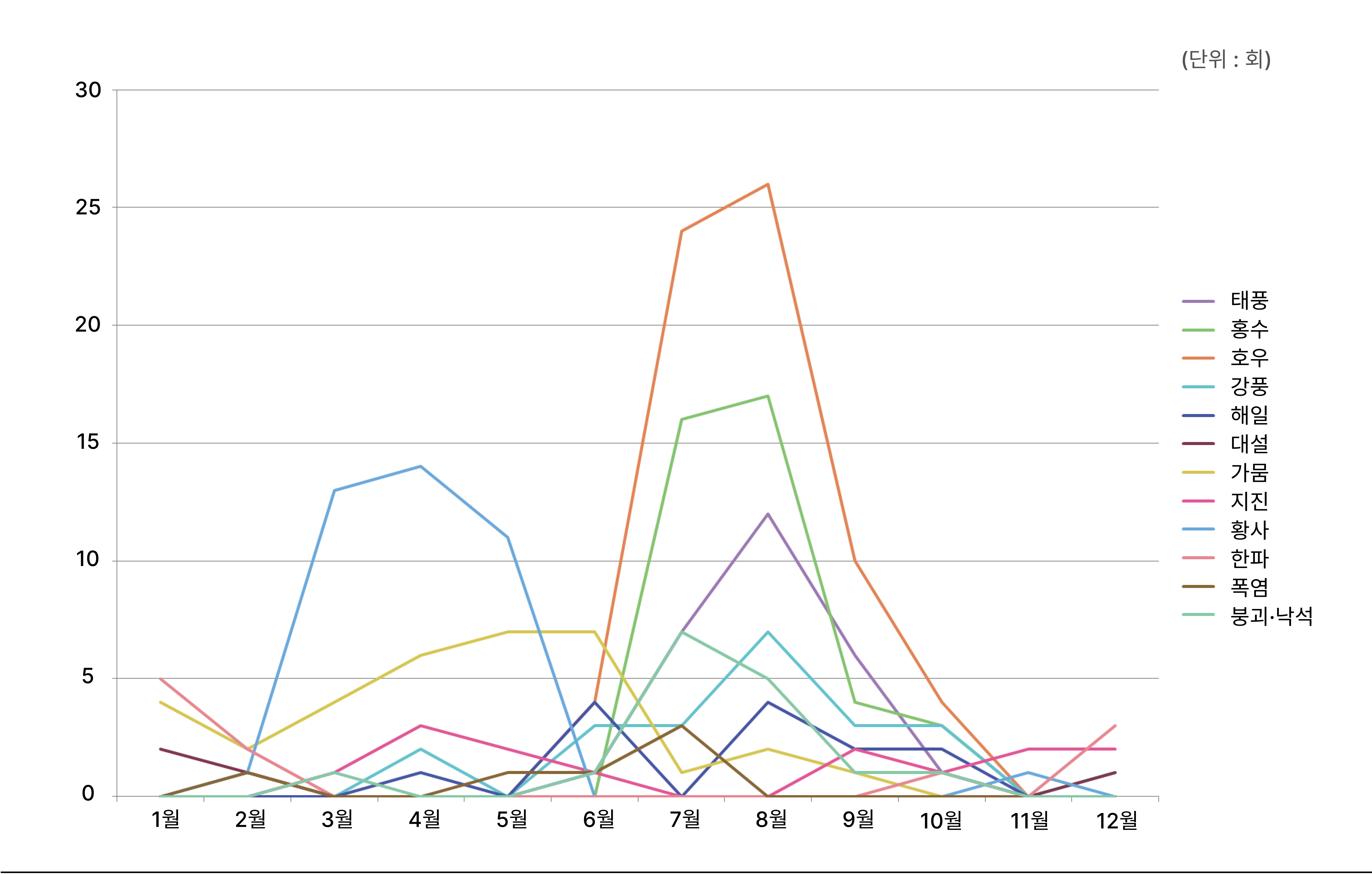 주: 1) 지속되거나 두 달에 걸쳐 발생한 자연재해의 경우, 최초 발생 건수를 기준으로 1건으로 처리하였음.