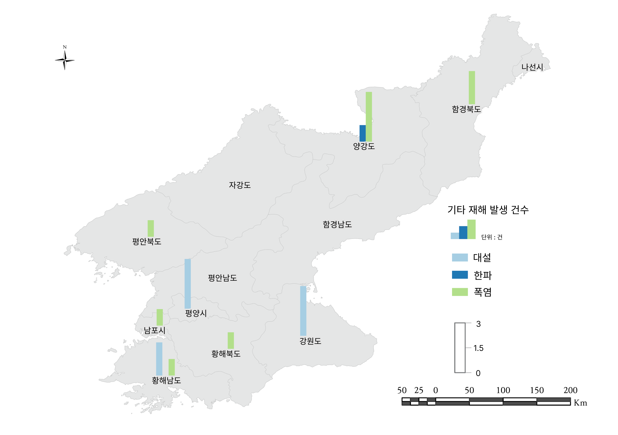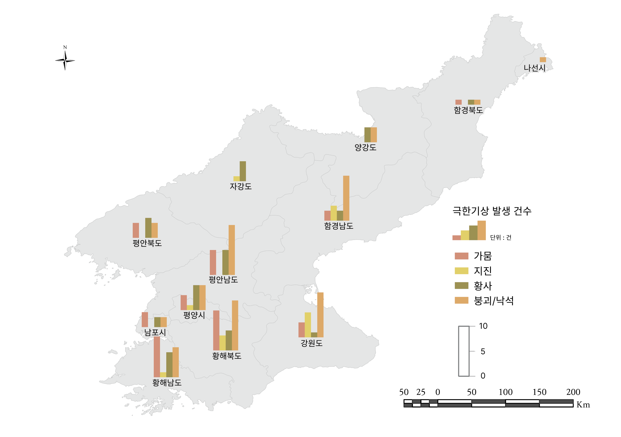 그리고 위성영상자료와 북한 뉴스자료이며, 이를 통해 수집된 유형별 자연재해 발생 횟수를 그래프로 작성하였다.
