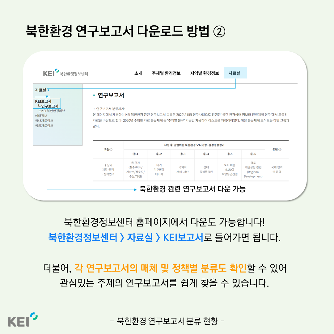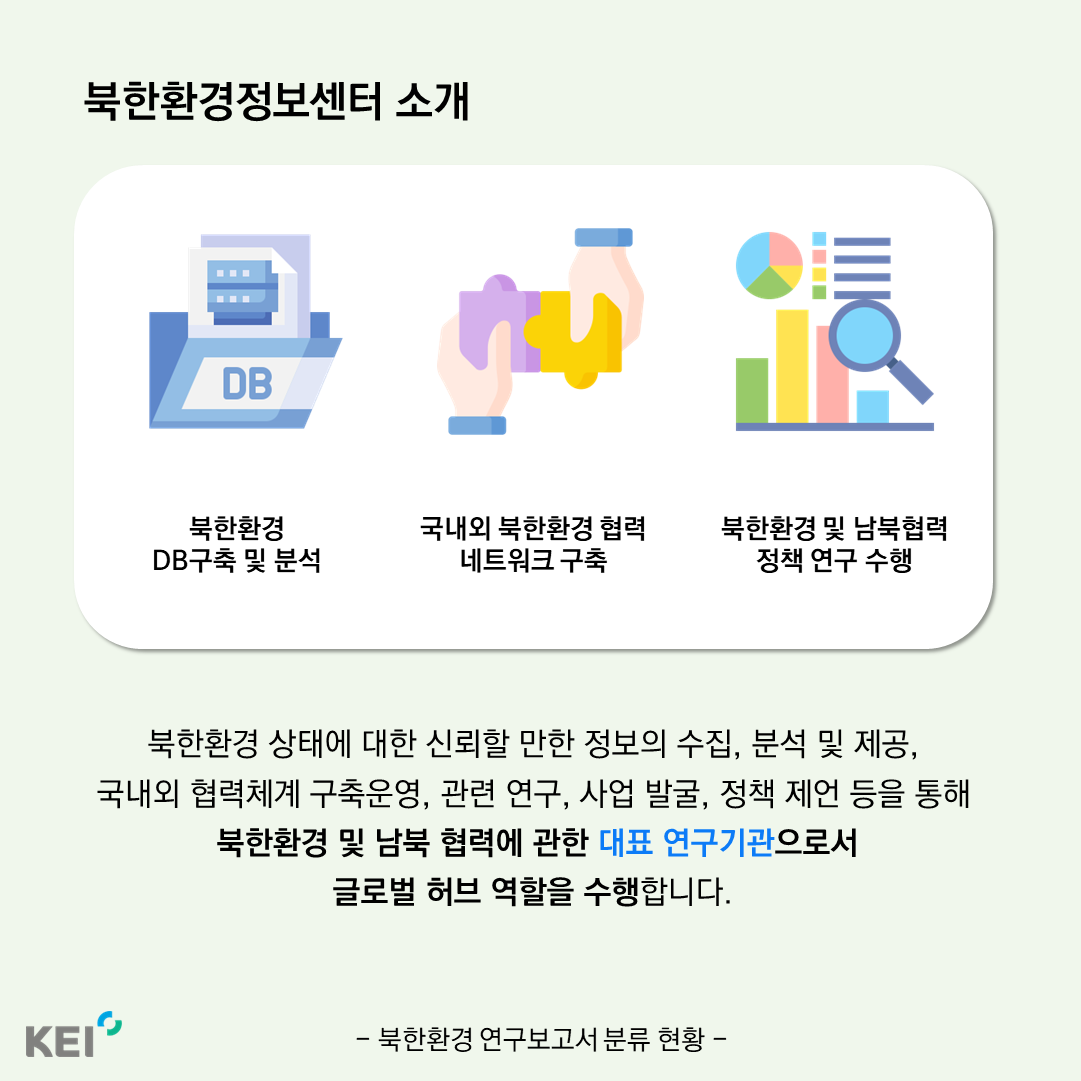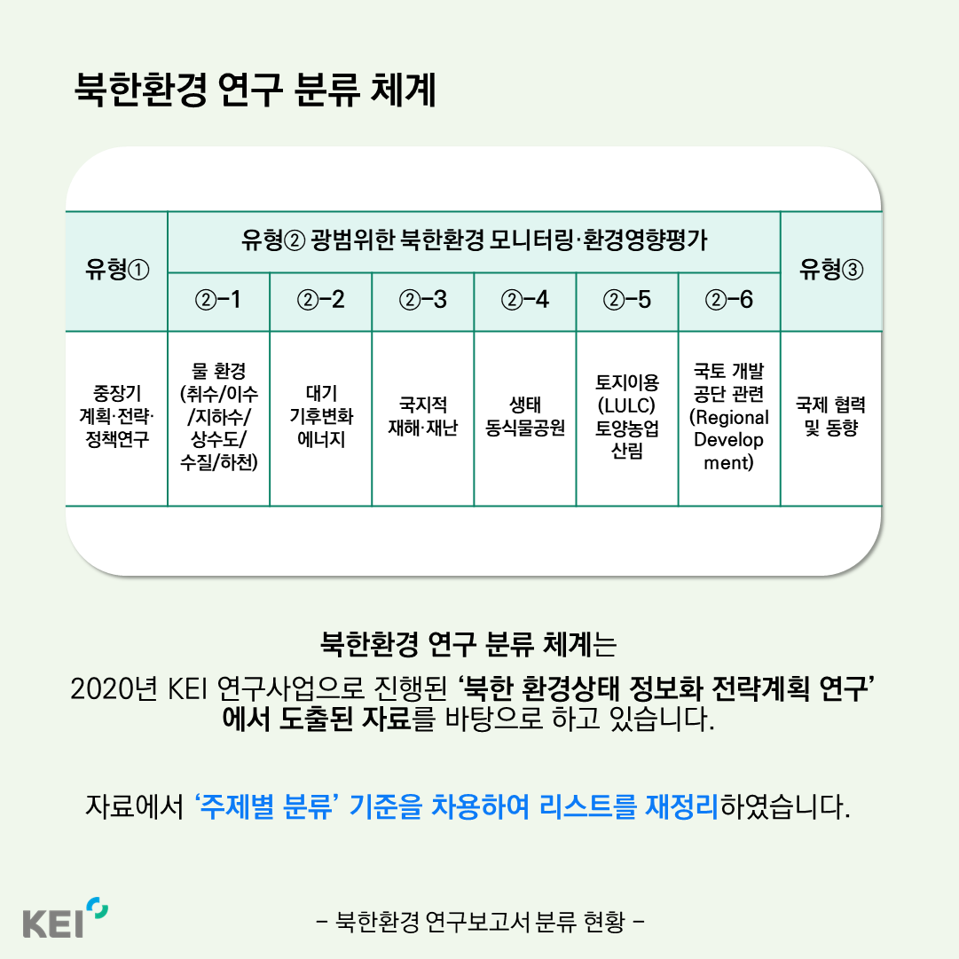주제별 환경정보 북한환경경정보를 주제별로 분류하여연구한 내용을소개합니다.