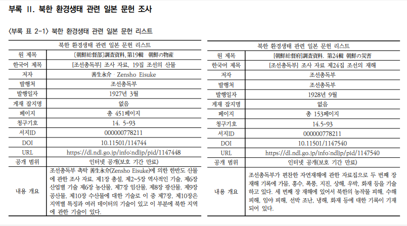 KEI 사업보고서(2020-10-01) ‘북한 환경상태 조사 및 남북 환경협력사업 개발 연구(총괄보고서)’ 부록 중 Ⅱ. 북한 환경생태 관련 일본 문헌 조사 (자료번호: 2419)